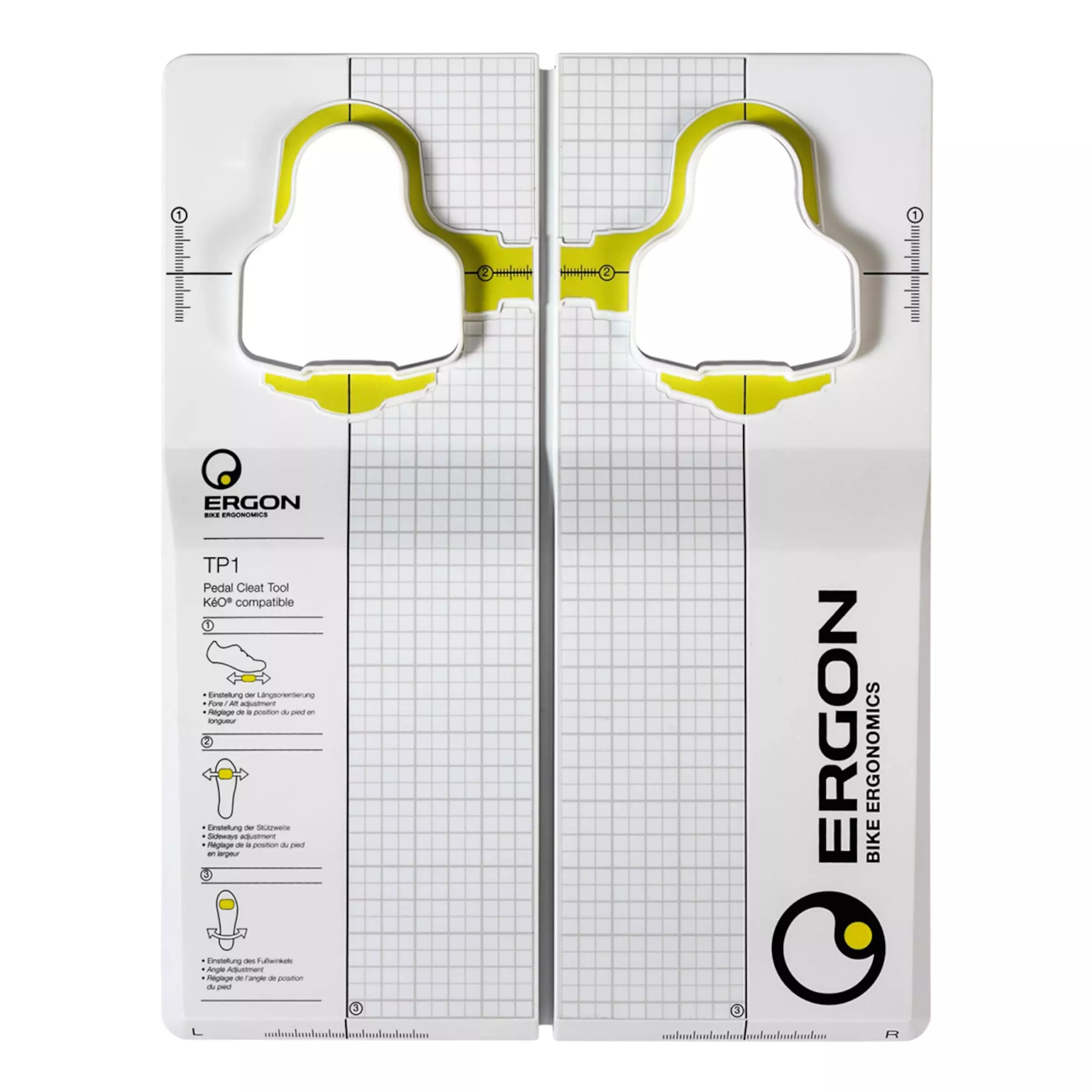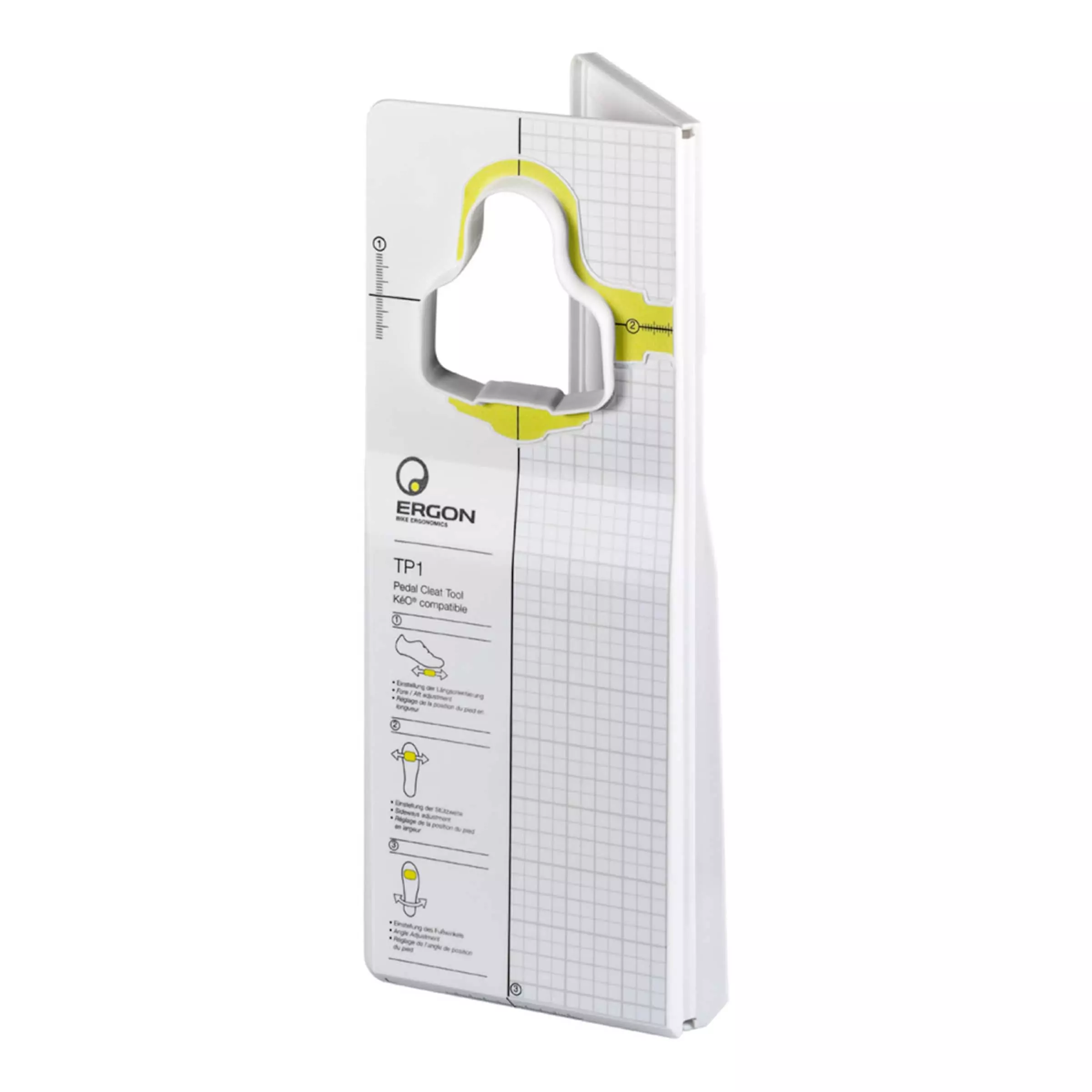 The Ergon TP1 Pedal Cleat Tool allows for a precise and easy adjustment of your Look Kéo cleats and makes for an ergonomically correct position of your feet on the pedals. Apart from a precise adjustment of the cleats to your cycling shoes, the TP1 tool allows you to adjust the position of your feet with grid patterns on top. The tool is made from polypropylene for high robustness. The included manual gives helpful tips as well as some basic information on ergonomics and on the tool’s handling.